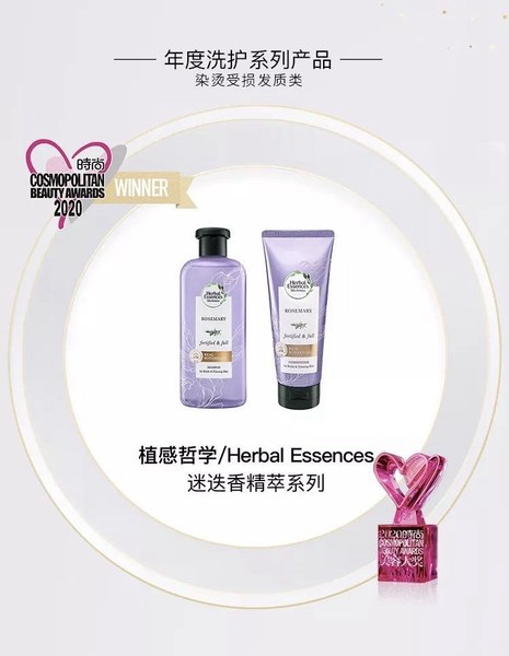 时尚COSMO“美容大奖”作为风靡亚洲的美妆业IP,是一年一度最值得期待的美容界“奥斯卡”,拥有强大的业界号召力和超高话题度,引领当代美妆消费趋势。Herbal Essences植感哲学迷迭香精粹系列荣获洗护大奖实至名归;迷迭香护发素荣登嘉人百大赏绝佳体验洗护单品榜单推荐。