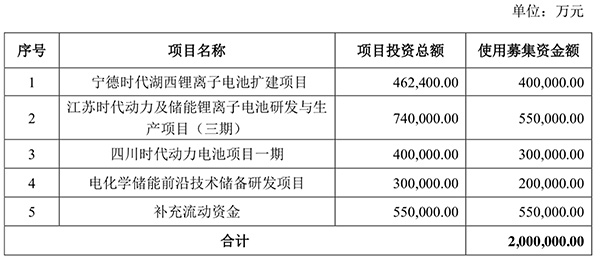 根据公告,宁德时代本次非公开发行股票募集资金总额不超过200亿元(含本数),在扣除发行费用后拟全部用于宁德时代湖西锂离子电池扩建项目、江苏时代动力及储能锂离子电池研发与生产项目(三期)、四川时代动力电池项目一期、电化学储能前沿技术储备研发项目和补充流动资金。