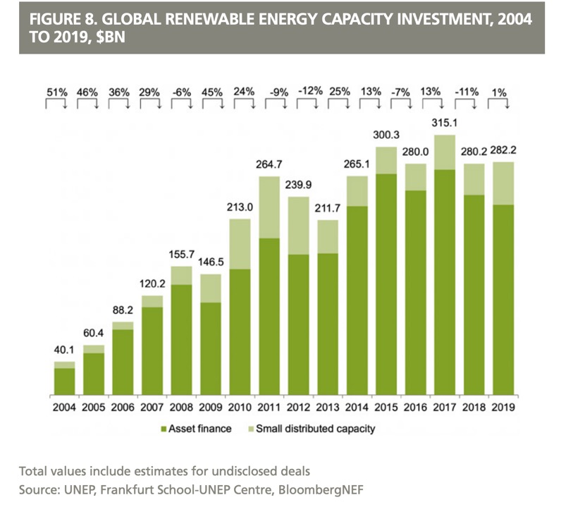 全球可再生能源投资额,2004年至2019年