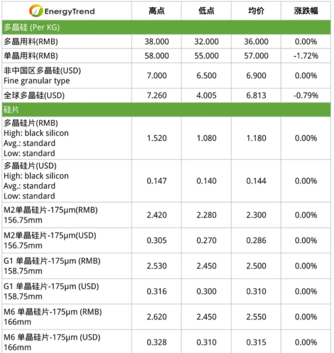 本周硅片价格整体价格走势与成交量趋于平稳。自硅片大厂调整价格告一段落后,本周的单晶报价大体呈现稳定的状态,且M6的硅片需求持续看好,而供给方面仍未爬升到稳定水平,故本周国内市场大硅片均价稳定在2.55元/片,海外均价稳定在0.315美元/片。反观多晶硅片的部分,价格持稳在每片1.08-1.52元之间,但因为需求量少,整体开工率低,虽然市场上的供应量已逐步减少,由于订单需求依旧惨淡,导致现有库存消耗仍然缓慢。