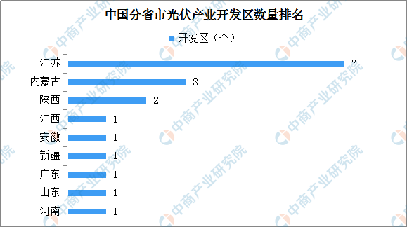 为了更全面的了解我国光伏产业发展现状,中商产业研究院梳理出国内光伏产业开发区18个。据不完全统计,国内光伏产业开发区主要分布在东部沿海地区、西北地区、中部地区的省份。按开发区数量来看,拥有光伏产业开发区数量最多的省市为江苏省,开发区数量达7个;其次为内蒙古,光伏产业开发区共3个;陕西拥有光伏产业开发区2个;江西、安徽、新疆、广东、山东以及河南各一个。