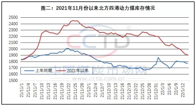 第一,北方港口动力煤库存持续减少。本报告期,北方港口的动力煤库存保持持续减少局面(见图二),比前一报告期末的1月7日减少了167.8万吨,比近期高点的2021年11月24日减少了539.4万吨,是北方港口现货动力煤资源继续偏紧、支持现货煤价继续上涨的主要因素。