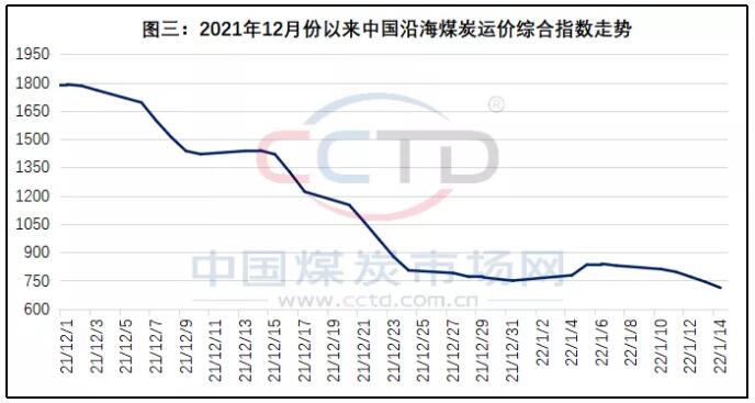 第三,春节前的集中备货需求逐渐舒缓。目前看,元旦过后出现的春节前补库或备货需求逐渐舒缓,一是部分需求已经基本得到解决;二是随着春节临近,各行各业的动力煤消费行将下降,抑制了部分采购需求;三是近期现货煤价上涨速度和上涨幅度均超出预期,对下游地区需求的抑制作用开始显现,其直接体现是,本报告期中国沿海煤炭运价综合指数继续下降,已经降至2021年3月份以来的低点(见图三)。